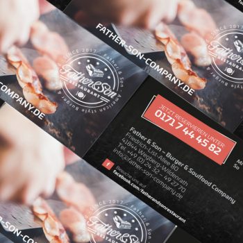 Der nächste Schritt bestand darin, die Umfirmierung und das erweiterte Angebot in die Welt zu schreien. Darum kümmerten wir uns. Mit viel Liebe presste Landes-Design-Minister Ralf ein neues Corporate Design aufs Papier. Während die Burger-Sachverständigen Lennard und Markus die Speisen und die sympathische Crew der Father & Son Burger and Soulfood Company ablichteten, erstellte Philipp optimierte Inhalte für die Webseite.