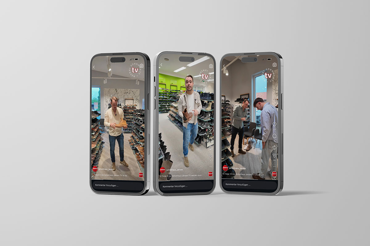 Schuhhaus Jansen TV: Ein eigenes Videoformat für Social MediaSocial Media lebt von Regelmäßigkeit, Persönlichkeit und Wiedererkennung. Für das Schuhhaus Jansen betreuen wir seit längerer Zeit die Social-Media-Kanäle mit Foto- und Videocontent.Mit „Schuhhaus Jansen TV“ haben wir diese Betreuung um ein festes Videoformat erweitert, das genau diese Faktoren vereint. Jeden Mittwoch erscheint eine neue Folge – direkt aus dem Schuhhaus.